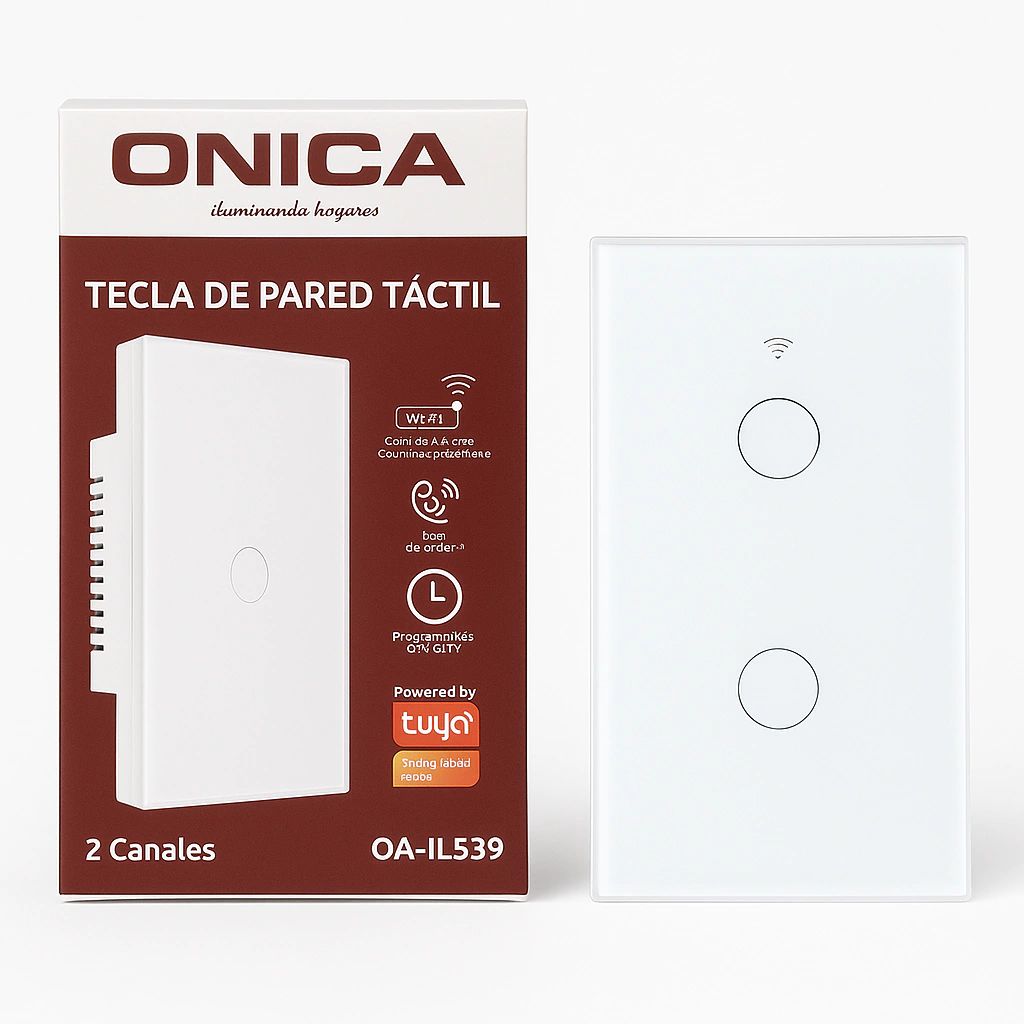 Controlá la iluminación de tu hogar de forma inteligente con esta elegante tecla táctil WiFi de 2 canales. Su diseño moderno con acabado en vidrio templado negro le da un toque sofisticado a cualquier ambiente.